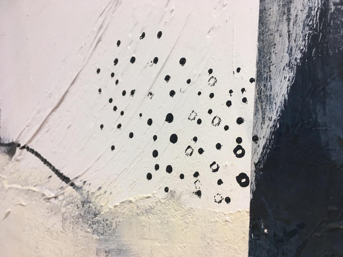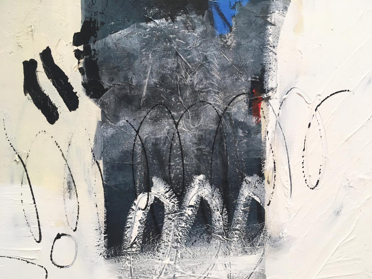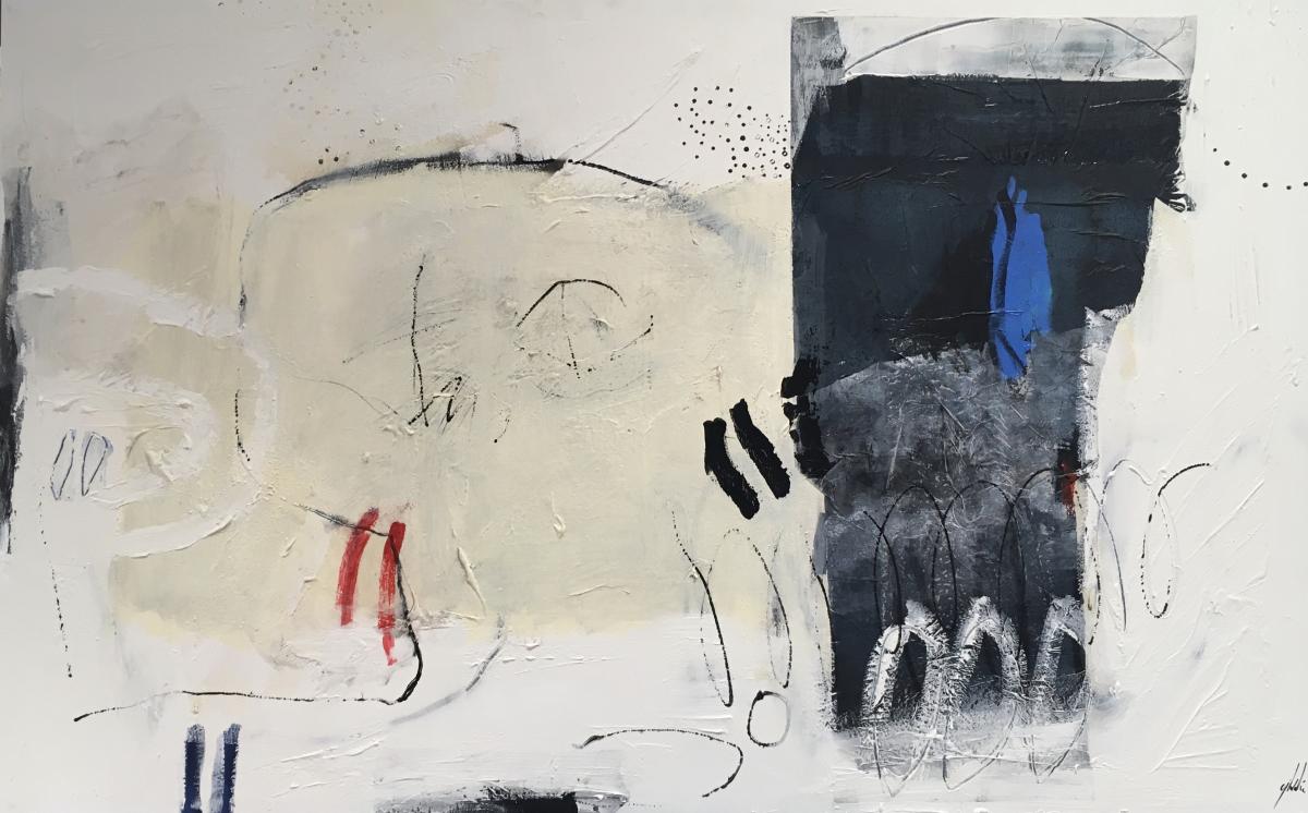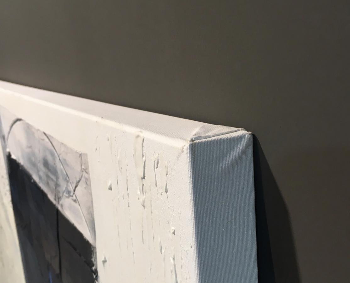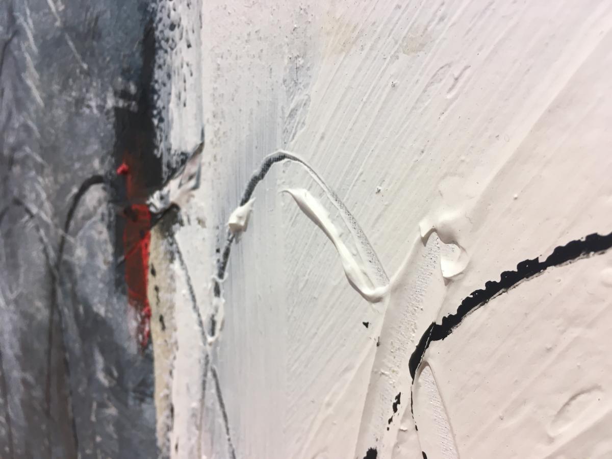 Realizado en tonos crema ,blanco,negros con detalles en rojo y azul. Destacan suaves relieves de pintura en todo el cuadro y los cantos son blancos.