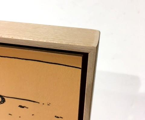Laminado de una viñeta de tintin relacionado con todos los automóbiles que aparecen en sus cómics y aventuras. Enmarcado al estilo caja americana o de cajón , con madera de roble.