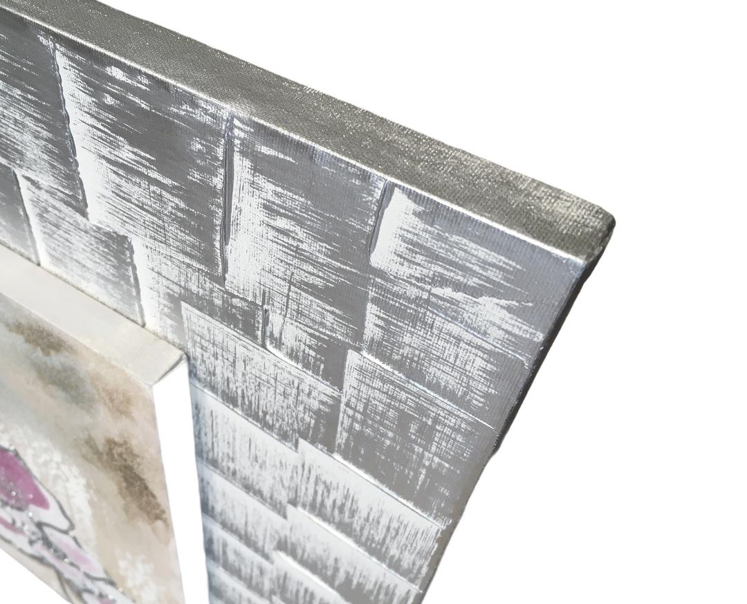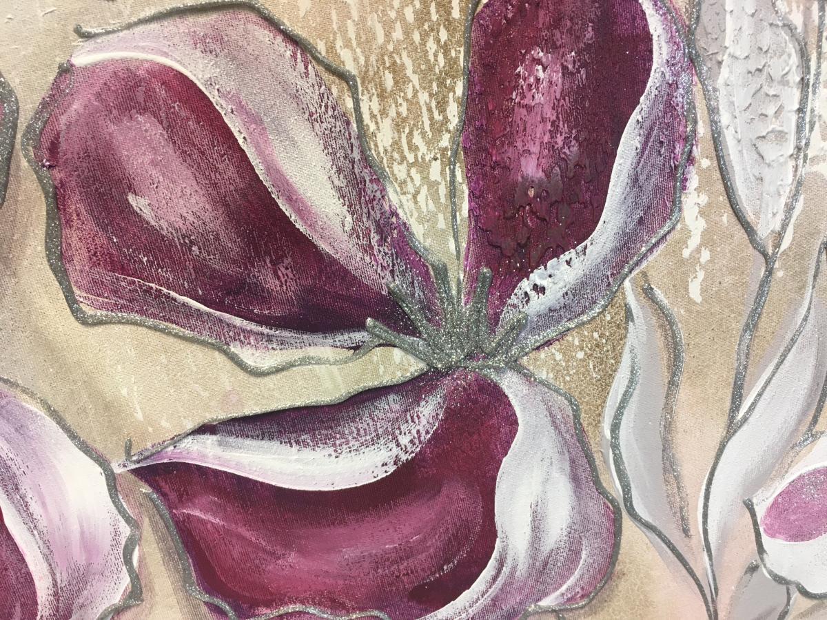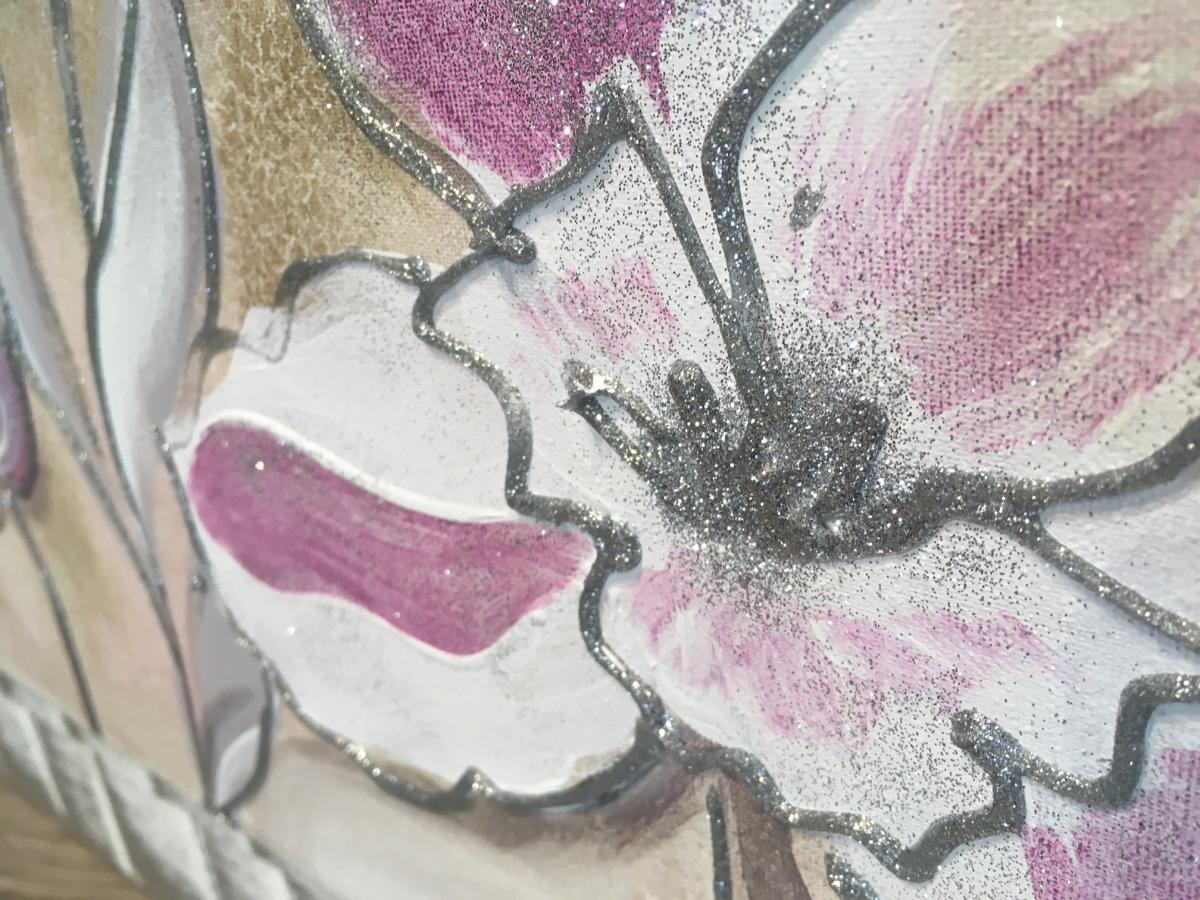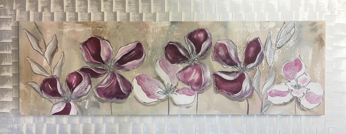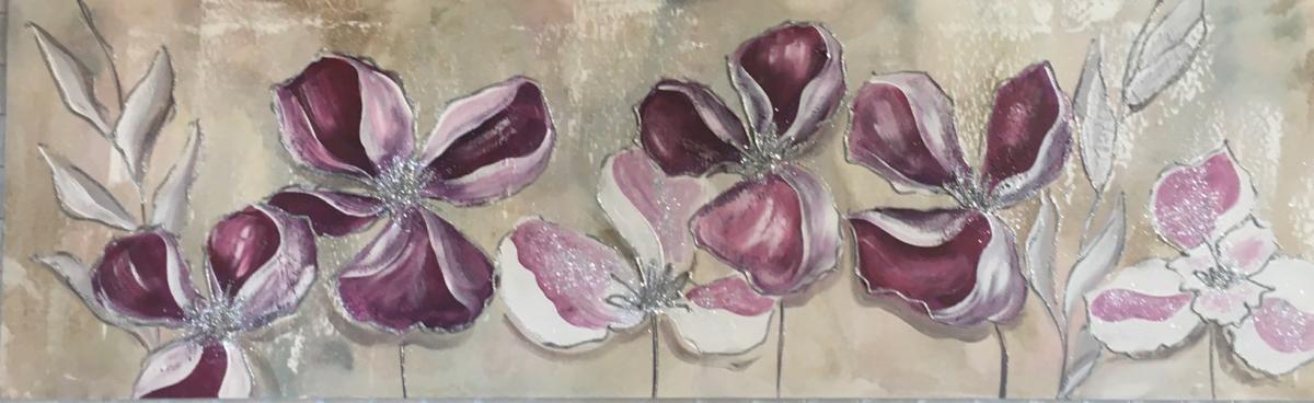 Técnica en pintura con relieves de la misma. Acabados bordeando las flores en plata. Bastidor interior con flores y exterior decorado con cuadrícula en plata y blanco.