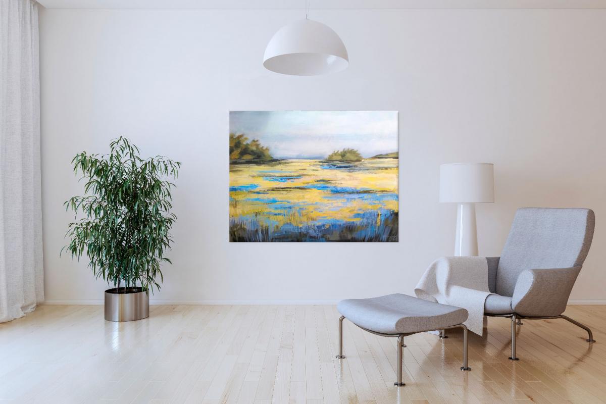 Representación de una marisma mezclando colores pastel, destacando el amarillo y azul...
