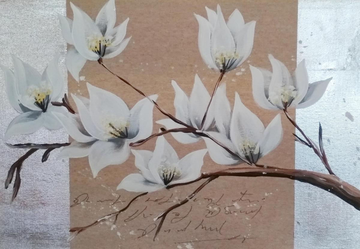 Flores de almendro en blanco con purpurina, remata laterales con bandas en pan de plata.