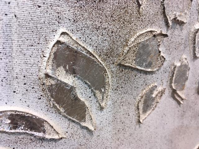 Técnica con relieves de flores y ramas totalmente en blanco con acabados en pan de plata.