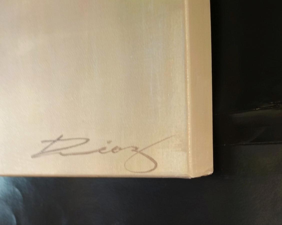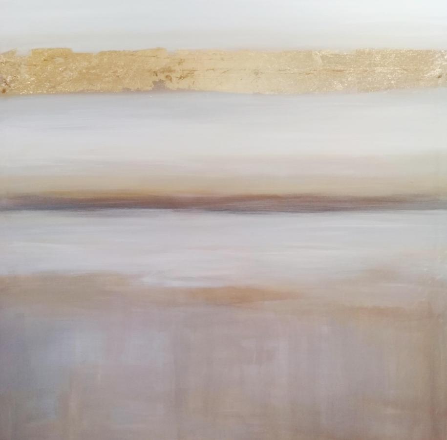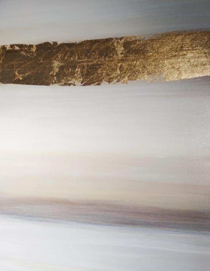 Destacan las pinceladas en color oro sobre fondo en color blanco roto y tonos ocres.