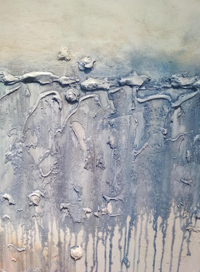 Destaca el color azul pastel con gran textura y relieves, sobre fondo blanco roto y pinceladas grises y rosadas.