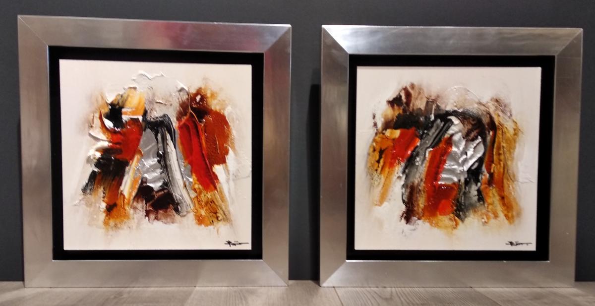 Técnica con notables relieves de pintura en colores rojos,negros,naranjas y plata