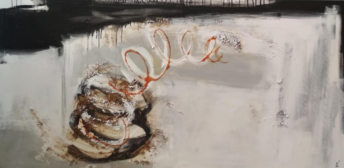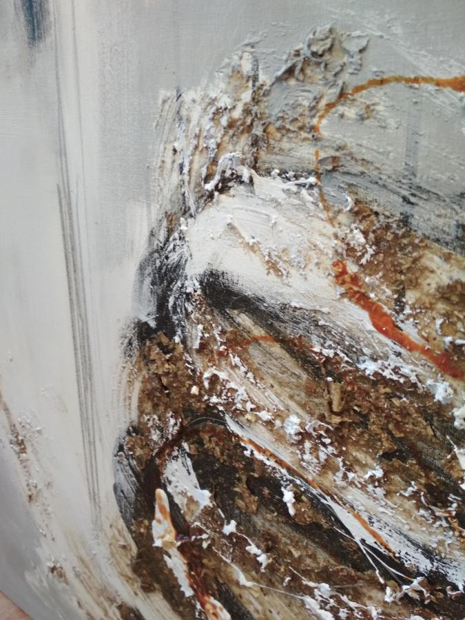 Tonalidades en negro, ocres, pinceladas en color naranja, sobre fondo blanco.Destacan notables relieves de pintura.