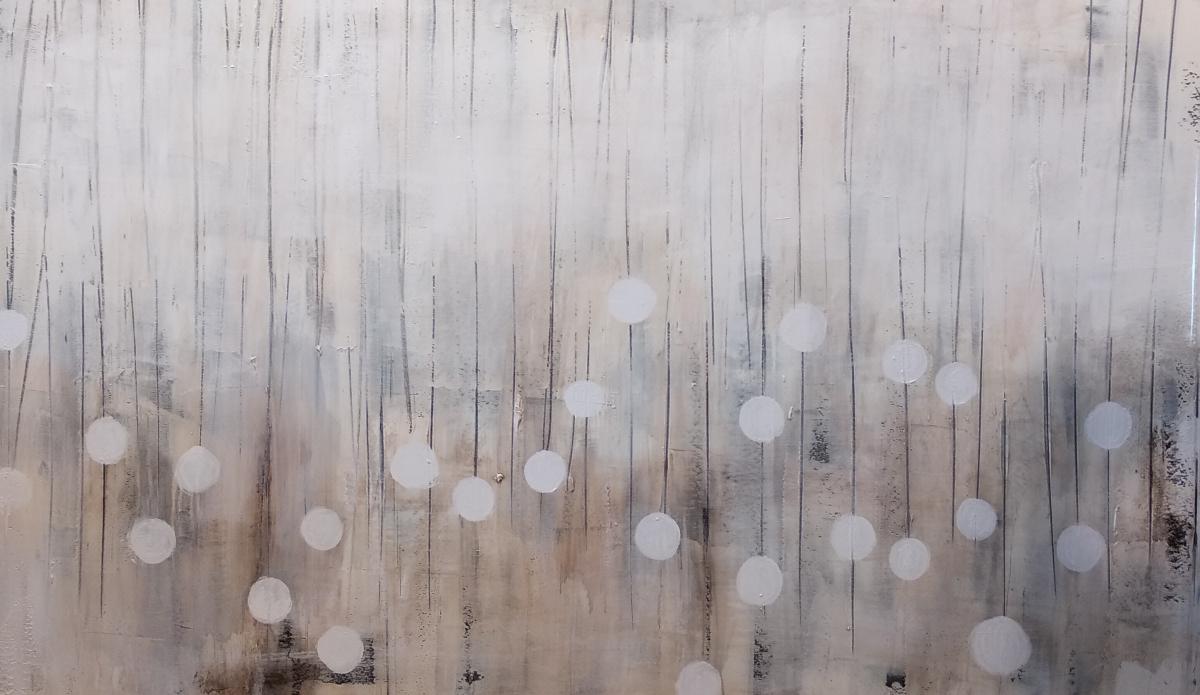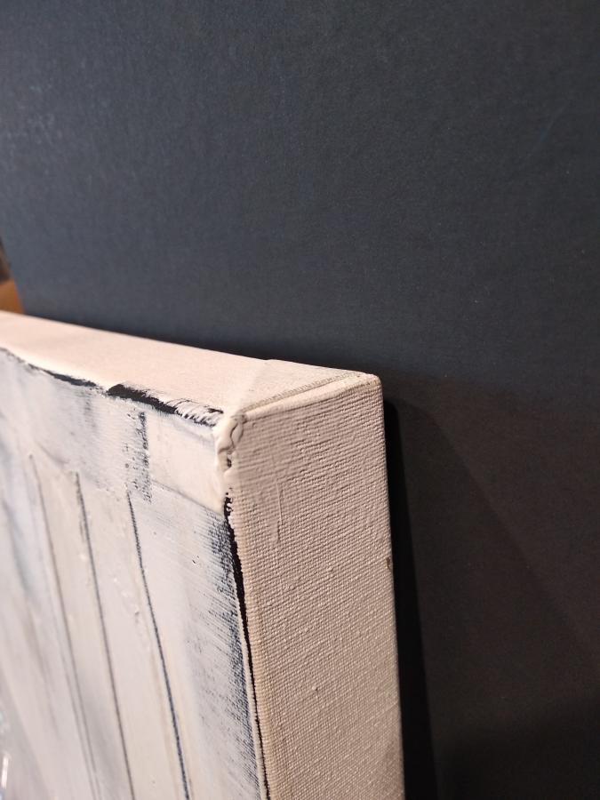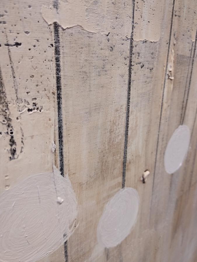 Realizado en tonos grises ,blanco,marrón y líneas en negro. Destacan suaves relieves de pintura en todo el cuadro.Cantos en color blanco.