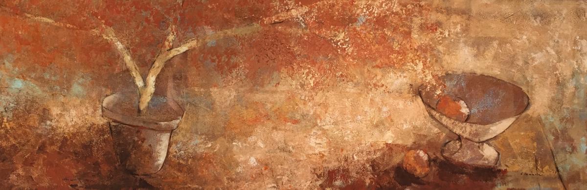 Pintado a mano sobre lienzo y montado en bastidor grueso. Tonos tierra reflejando suaves relieves.