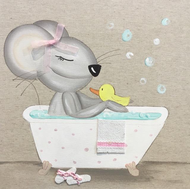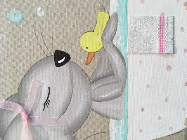 Tonalidades en marrón, azul, rosa, blanco, gris y toque amarillo. Detalles sobrepuestos lazo, toalla y zapatillas.