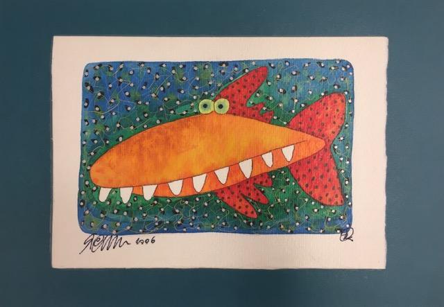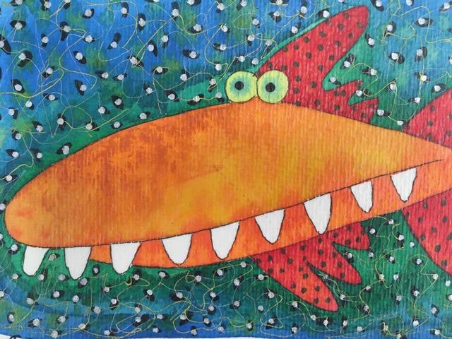 Divertido pez sonriente en tonos rojos, naranjas y fondos azul y verde.