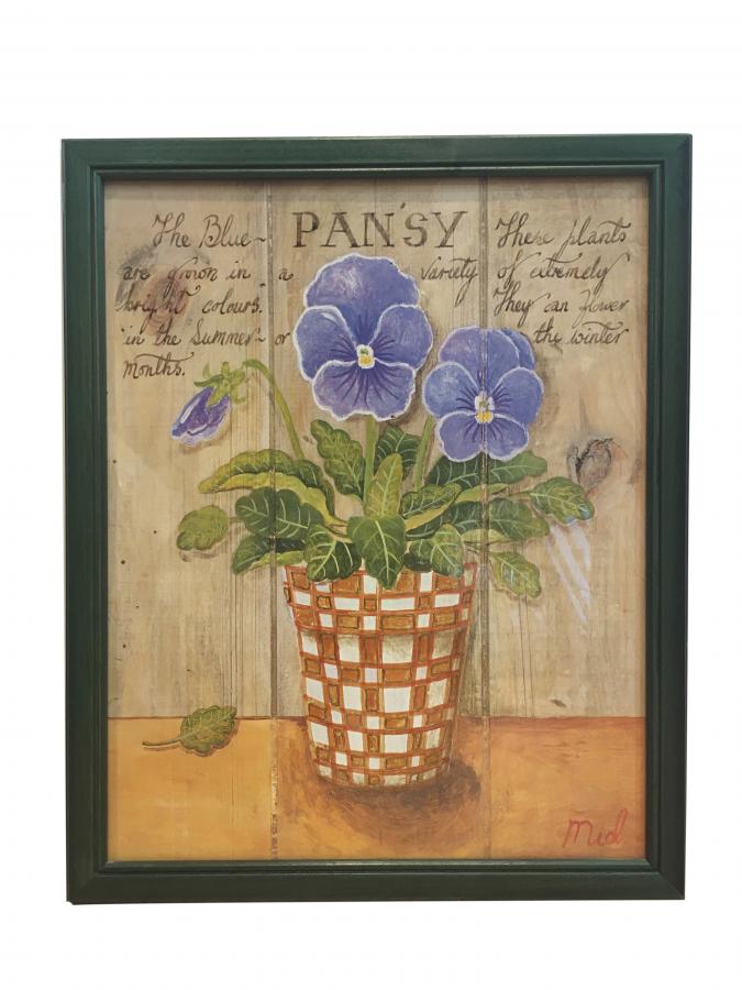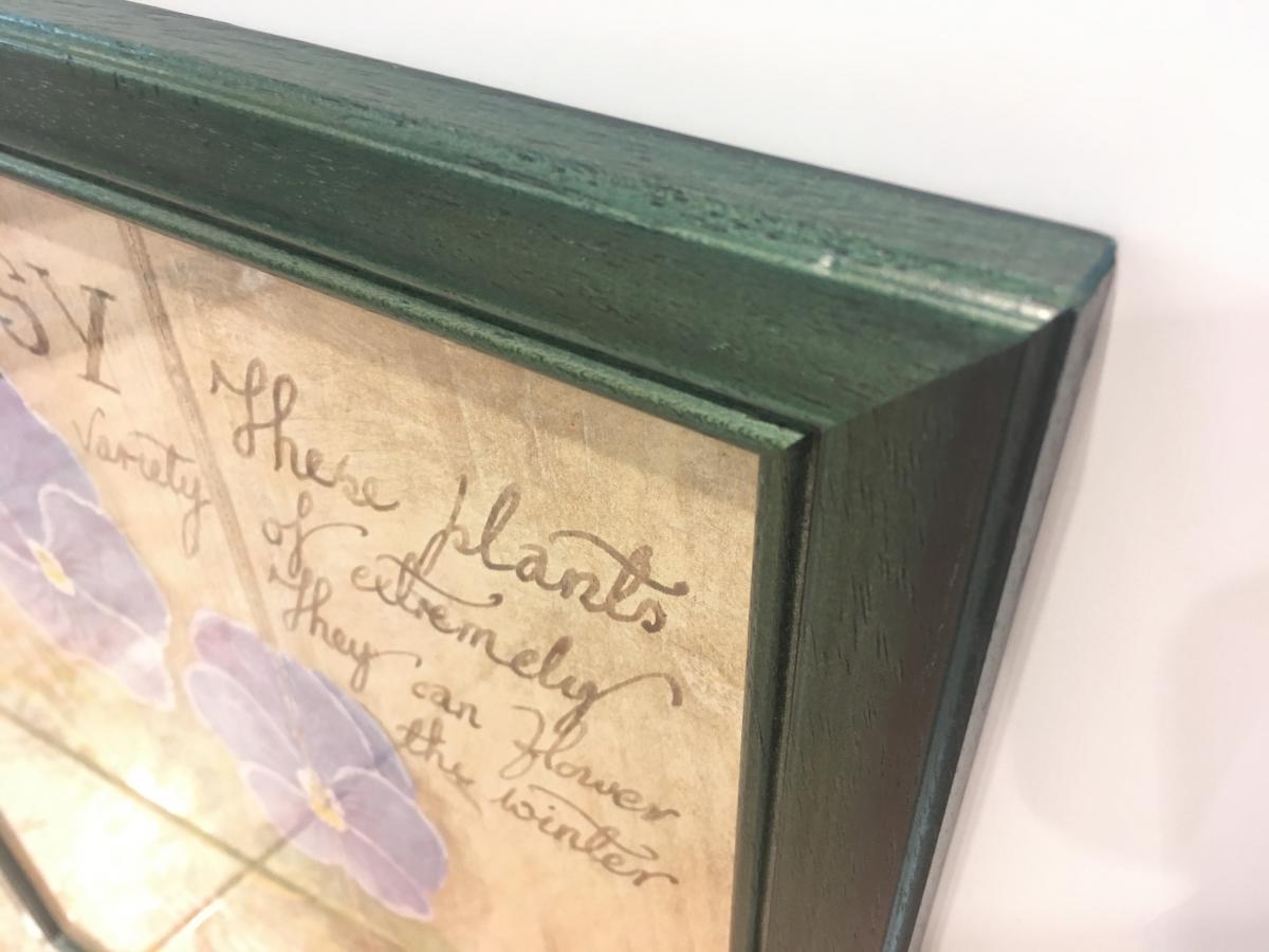 Lámina con la imagen de una planta con flores azules. Enmarcada con moldura verde y cristal brillo.