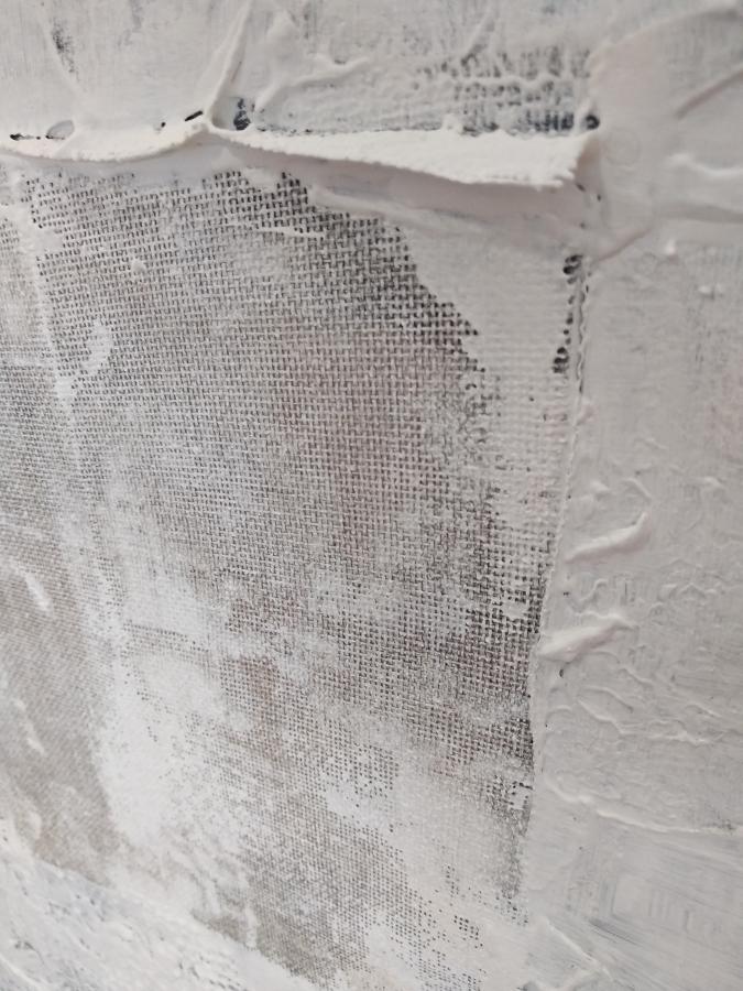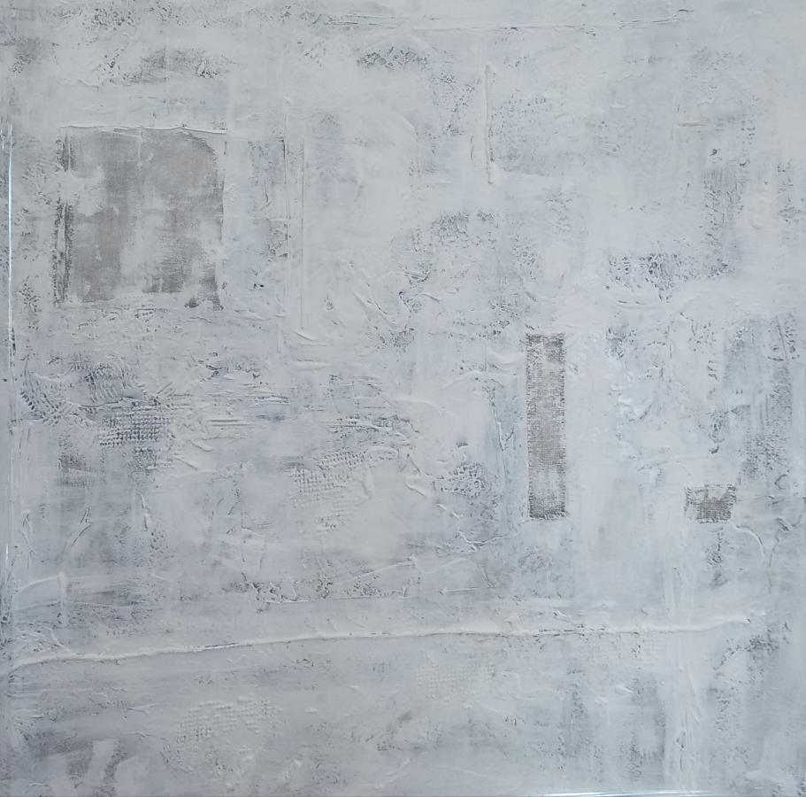 Realizado con técnica mixta en materiales rústicos relevados y pintura efecto yeso envejecido. Detalles en plata.