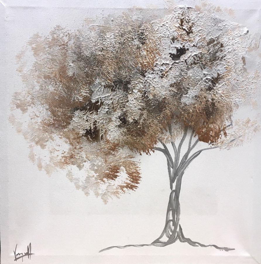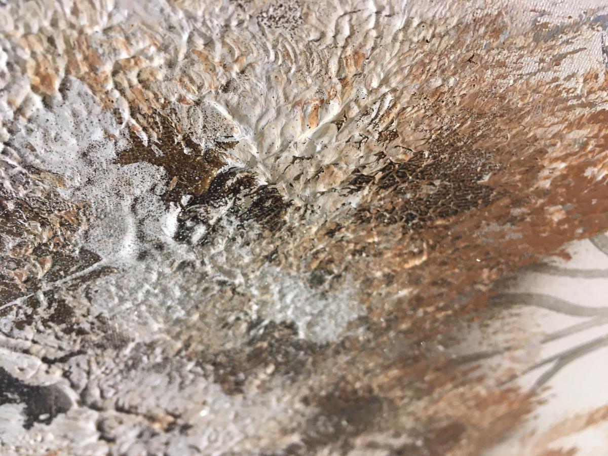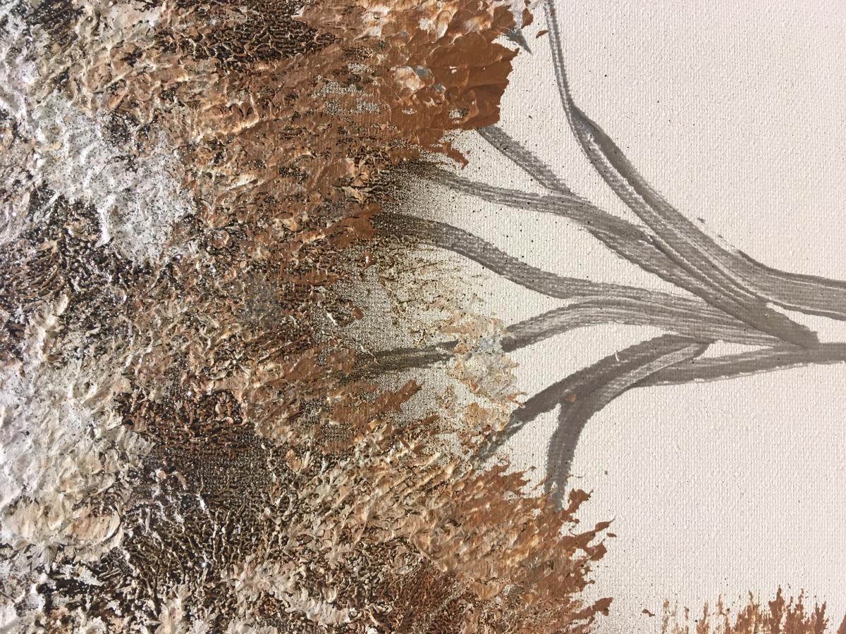 Tonalidades en marrones y plata, con acabados en purpurina y leve relieve de pintura plata en tronco Cantos del cuadro en color negro.