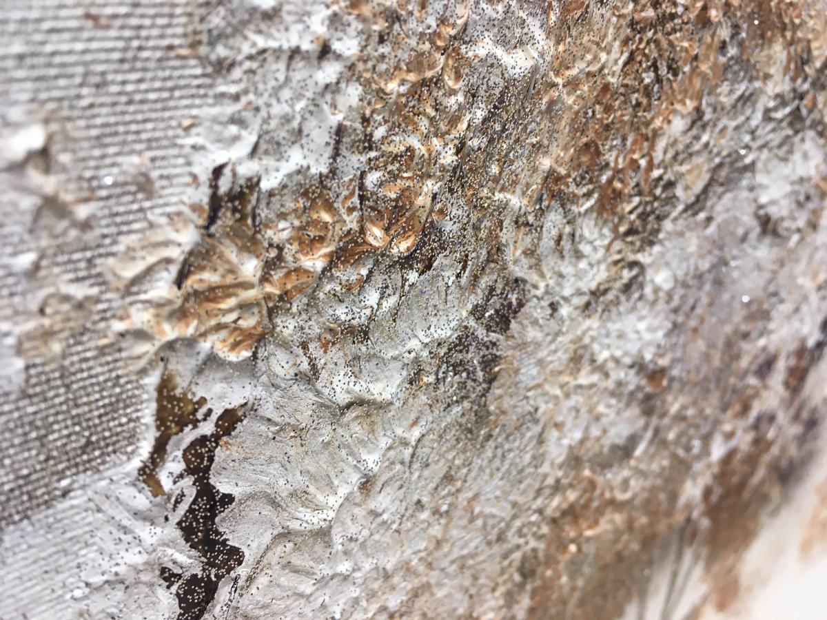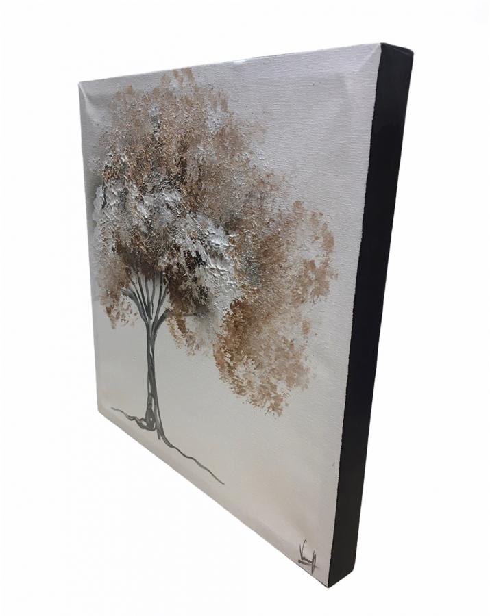 Tonalidades en marrones y plata, con acabados en purpurina y leve relieve de pintura plata en tronco Cantos del cuadro en color negro.