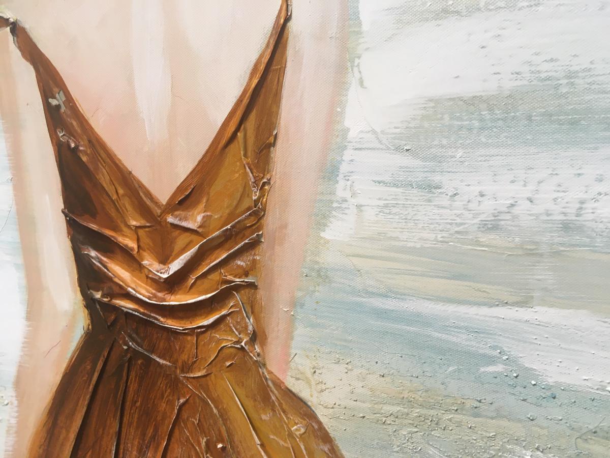 Tonos claros en turquesa, blanco, beige con dos veleros de fondo y gaviota, resaltando el vestido en tono teja.