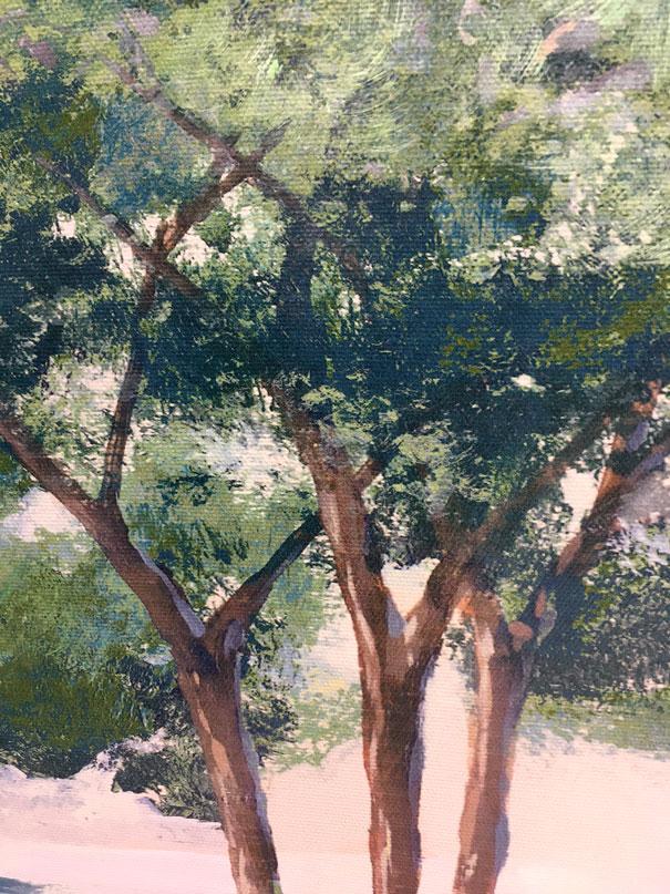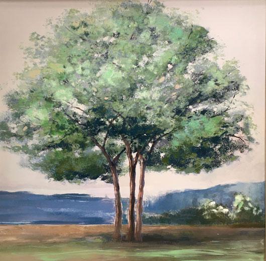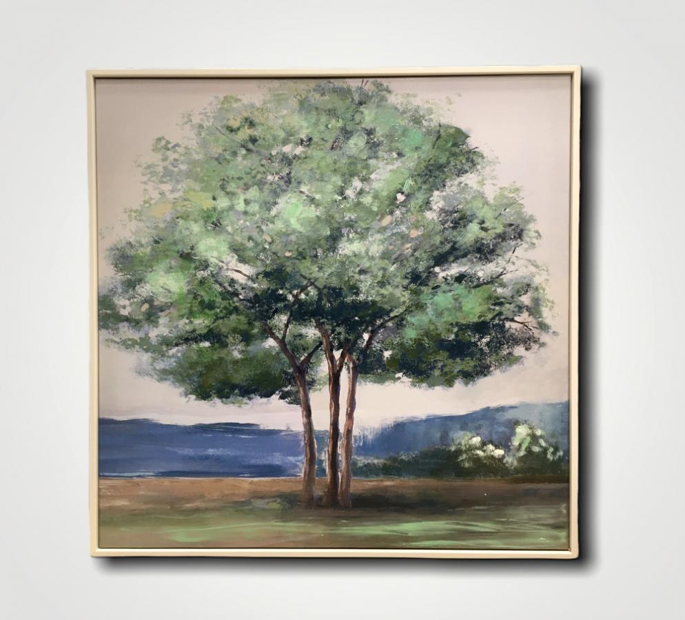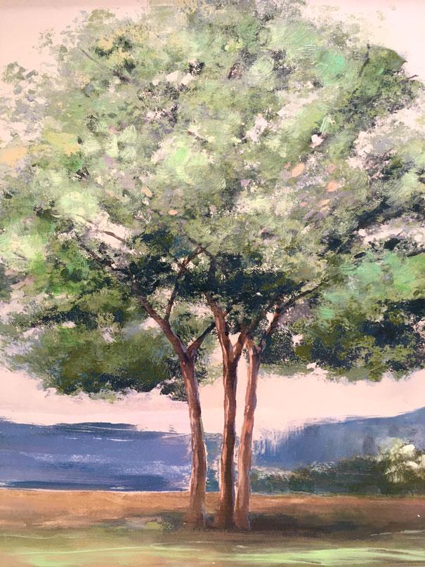 Paisaje de tres arboles en el centro de la composición, con tonos y luz primaveral.