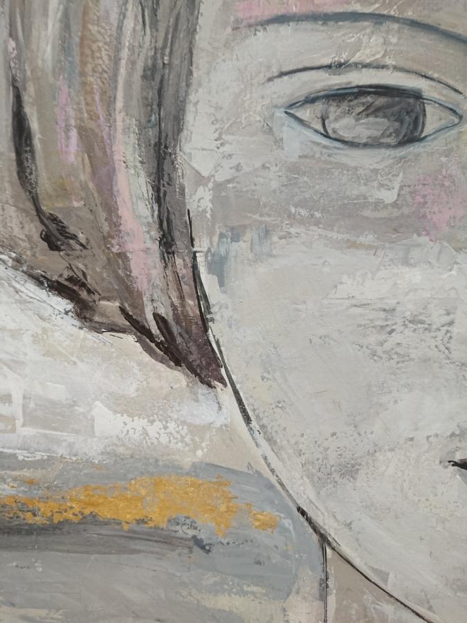 Tonalidades neutras en visón, beig y blanco con pinceladas en pan de oro. Cantos del cuadro en color blanco.