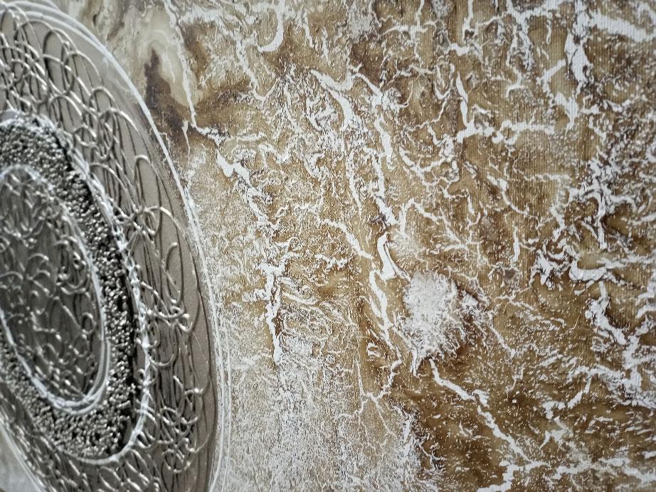 Cuadro montado en doble bastidor con tonos tostados y platas ideal para decorar un entorno cálido como un salón o una habitación.