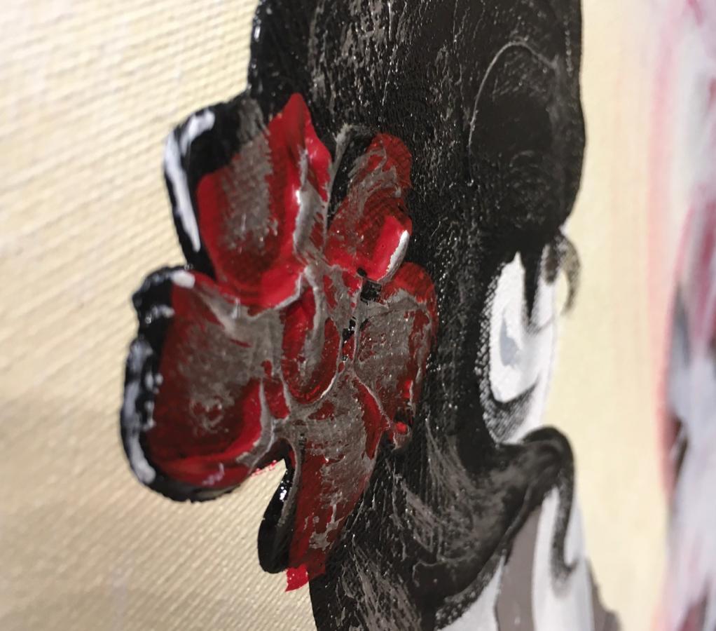 Tonalidades en rojo, negro, blanco y plata en vestido y adorno del pelo. Cantos del cuadro en negro.