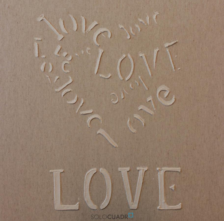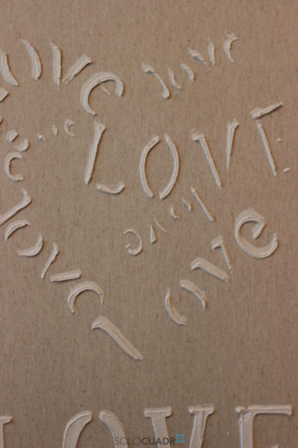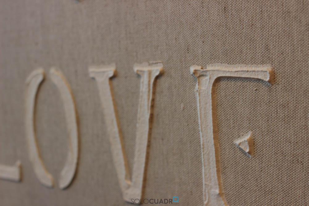 Sobre fondo de lino forma de un corazón con las palabras corazón y love en relieve.