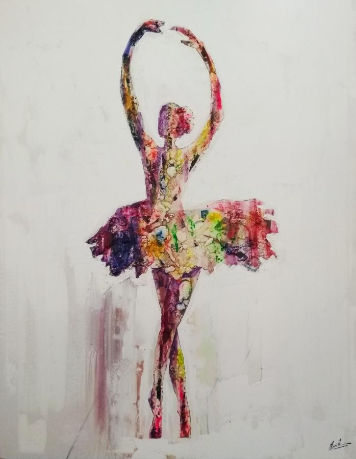 Representación de una bailarina en movimiento, utilizando colores vivos con relieves y cantos en blanco.