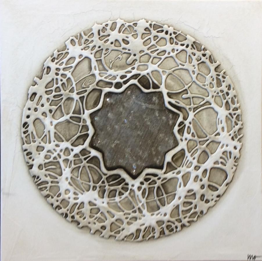 Núcleo en forma de estrella color gris/plata y purpurina ,con relieve blancos y fondo color nácar.