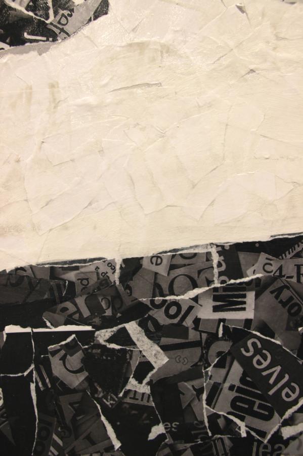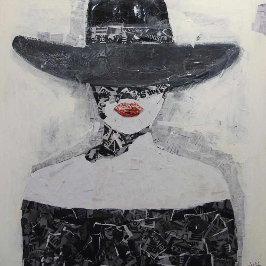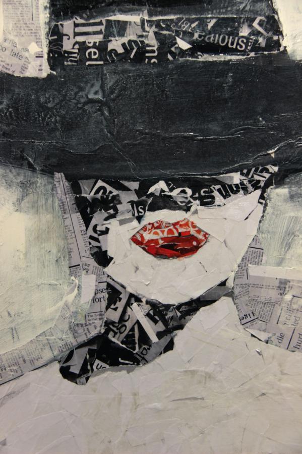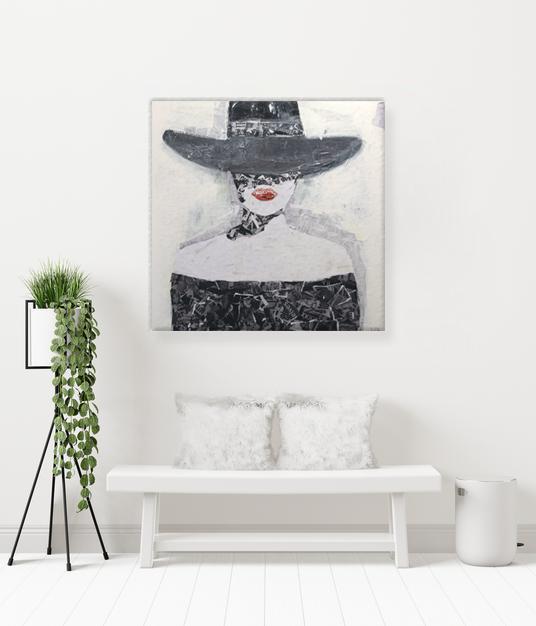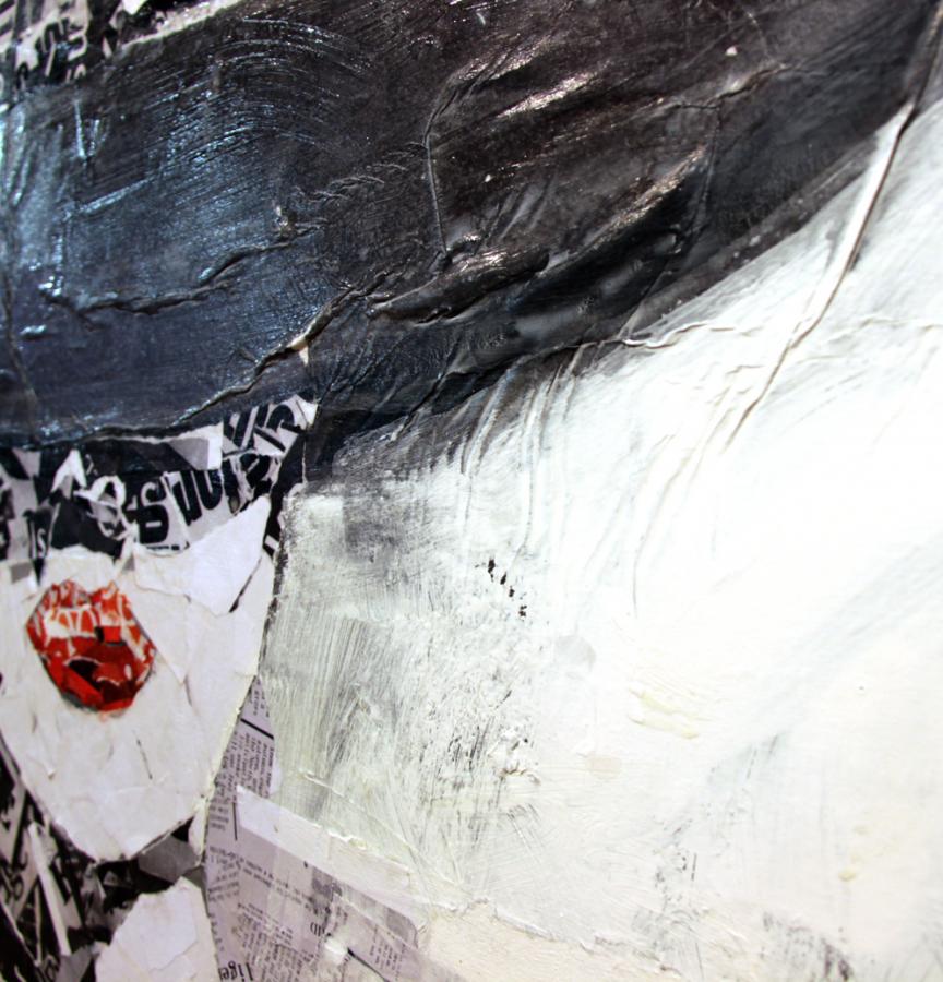 Cuadro original estilo moderno y pintado utilizando la técnica de collage, dando textura al lienzo, detalle rojo de los labios.
