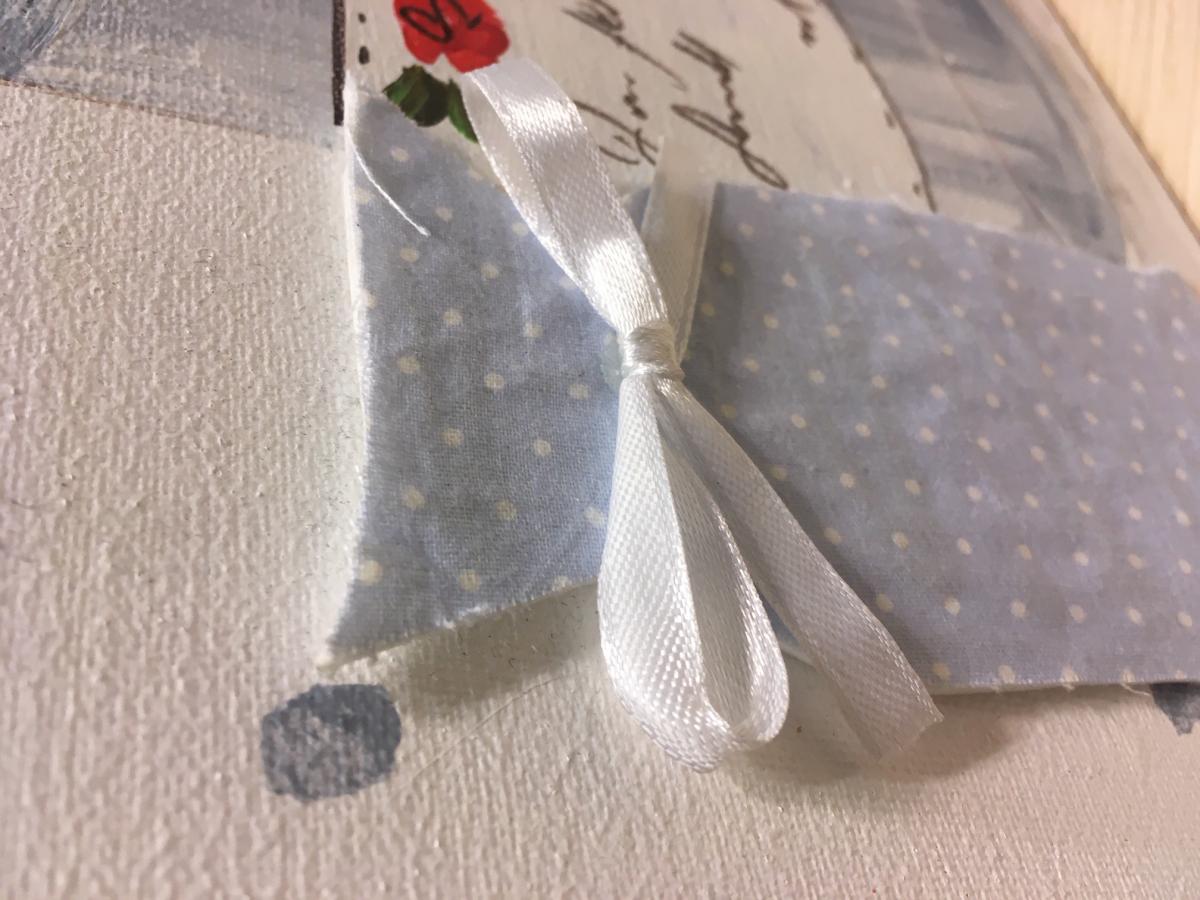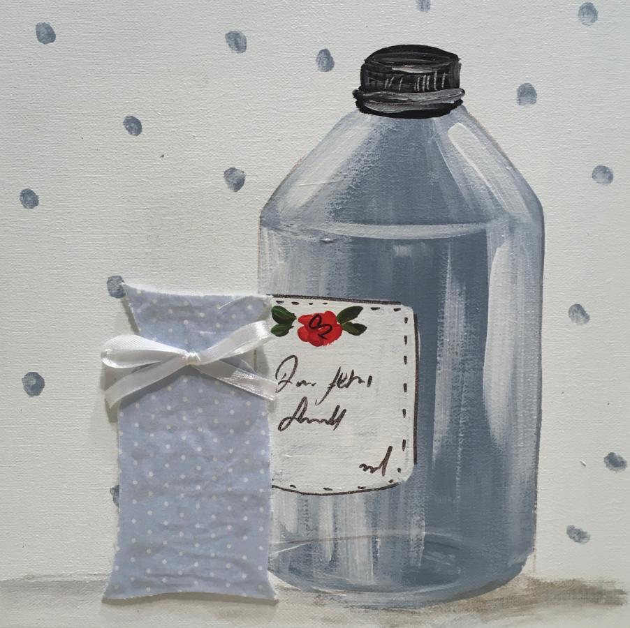 Bote de perfume antigüo estilo francés. Domina color azul con acabados en tela y lazo sobrepuesto. Realizado en fondo blanco con topos azules.
