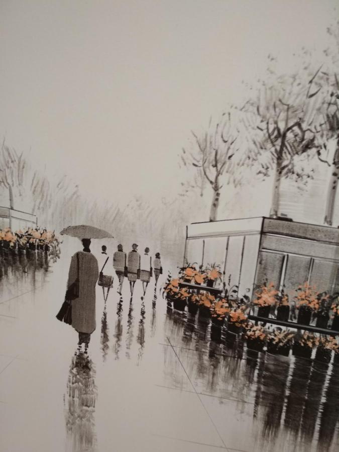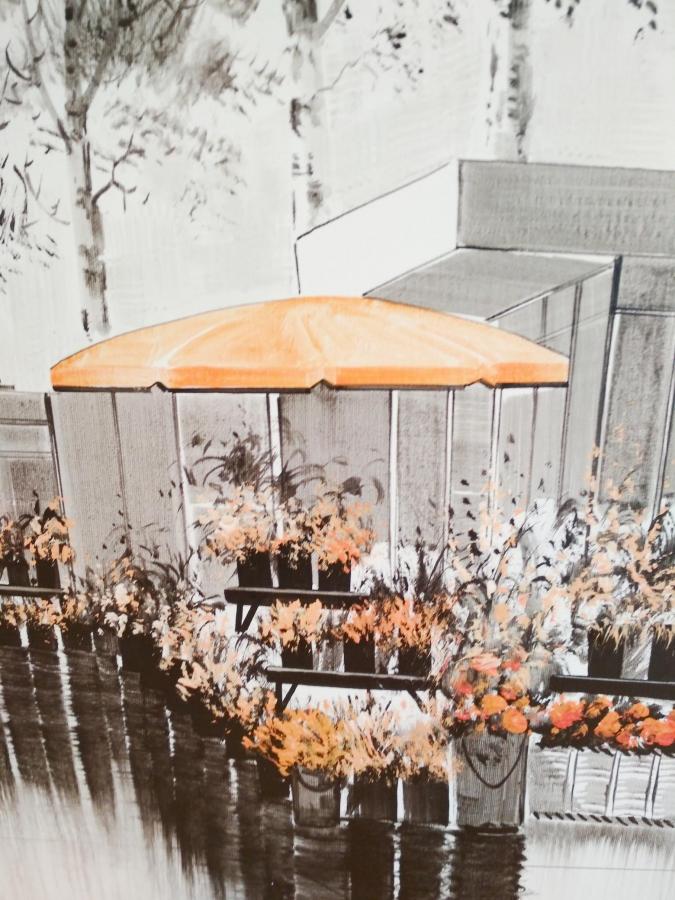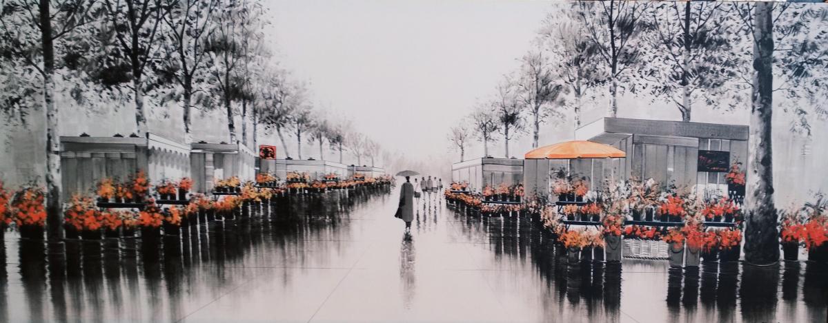 Ramblas en blanco y negro un día de lluvia con paradas de flores naranjas .