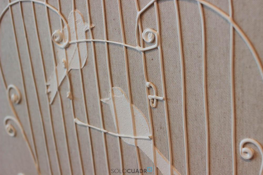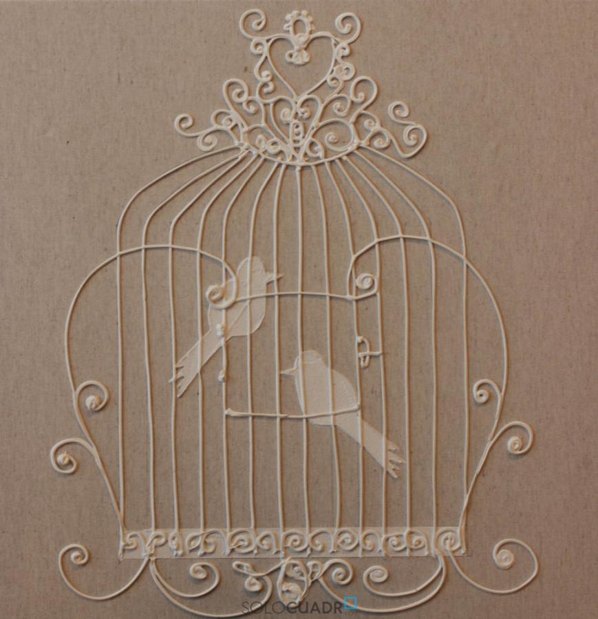 Sobre fondo de lino forma de una jaula con dos pájaros, realizada con material especial de relieve.