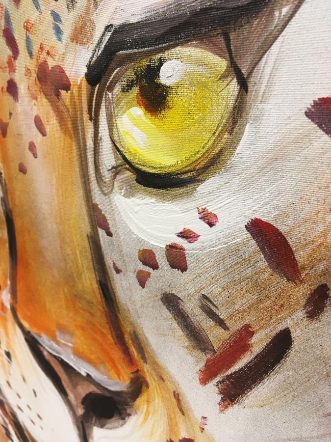 Sobre fondo blanco refleja la cara de un felino repunteado en colores vivos, ofreciendo un estilo original y diferente. Suaves relieves en acabados de pintura y cantos del cuadro en gris claro.