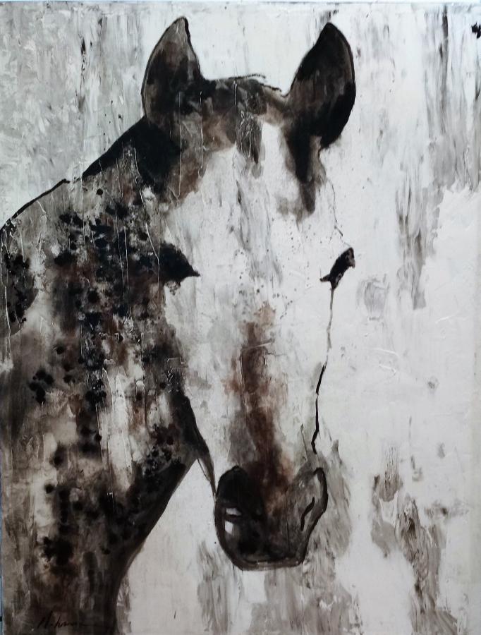 Figura de un caballo en tonalidades neutras y relieves de pintura. Cantos en color negro.