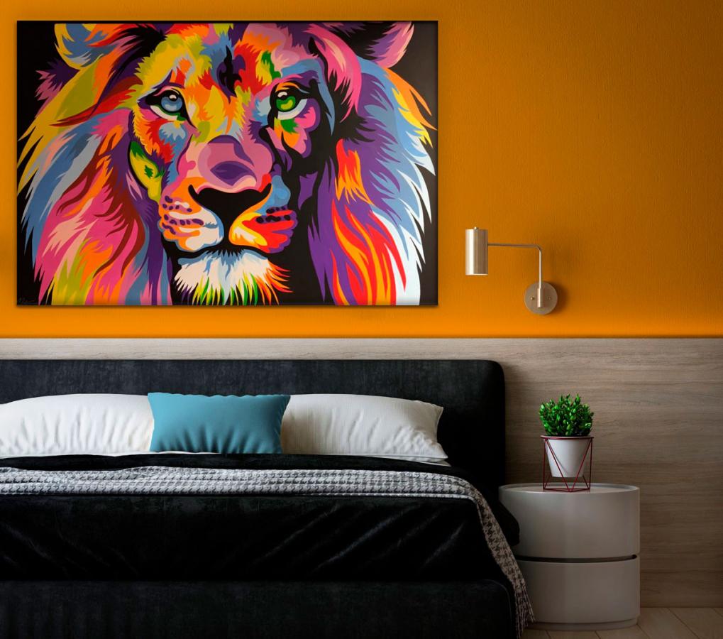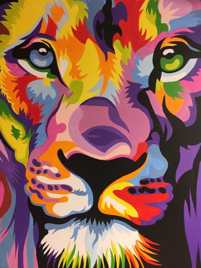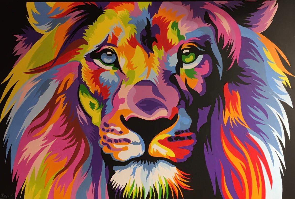 Colorido cuadro mostrando primer plano de la cara de un león.