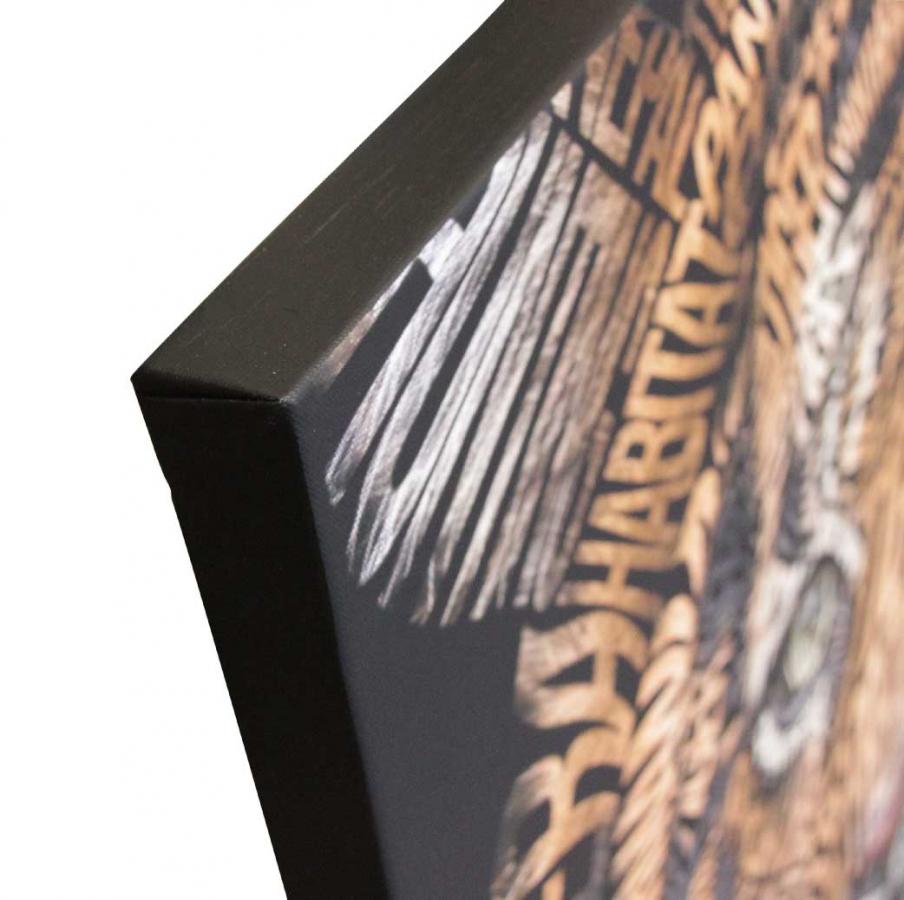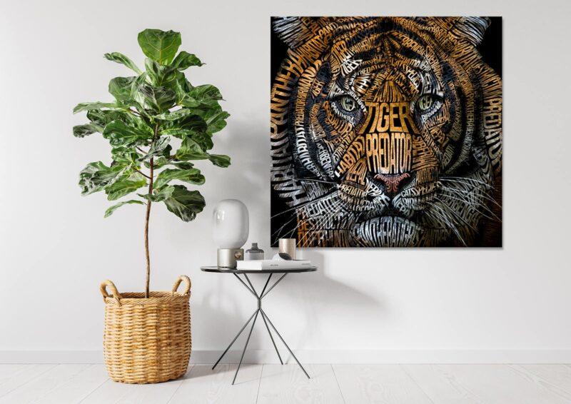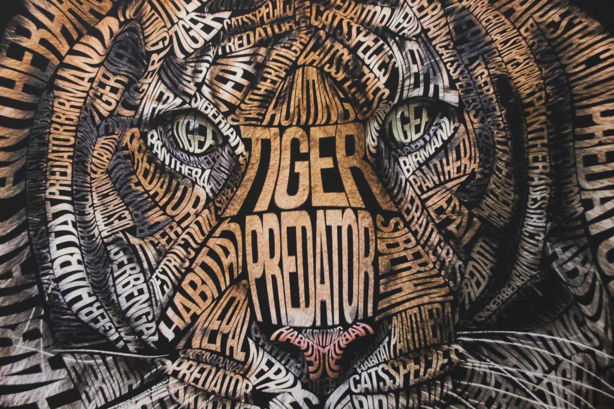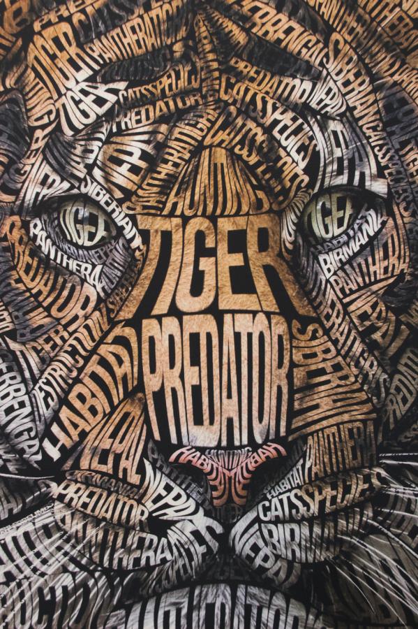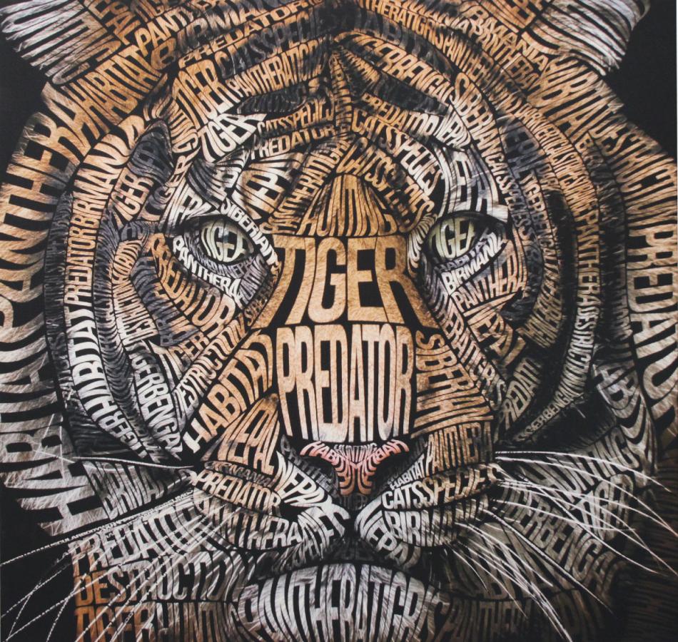 Original fotografía dando forma a la cara de un tigre formada por frases en diferentes tamaños de letra y color. Cantos del cuadro acabado en negro.