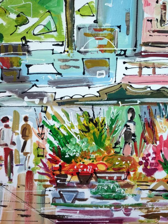 Representa una imagen moderna de las Ramblas de la ciudad de Barcelona. En tonalidades alegres y con pequeños relieves de pintura. Cantos en continuidad del dibujo.