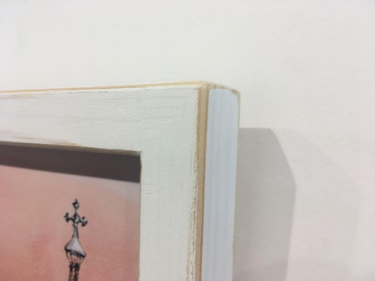 Cuadro laminado sobre madera con acabado mate. Enmarcado con la técnica caja americana o cajón, moldurqa blanca.