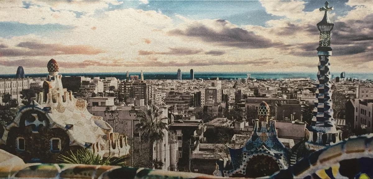 Cuadro Impresión digital del Parc Güell con la ciudad de Barcelona de fondo.