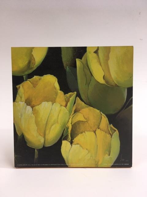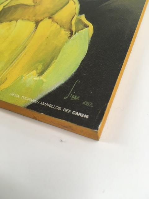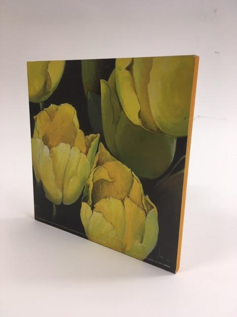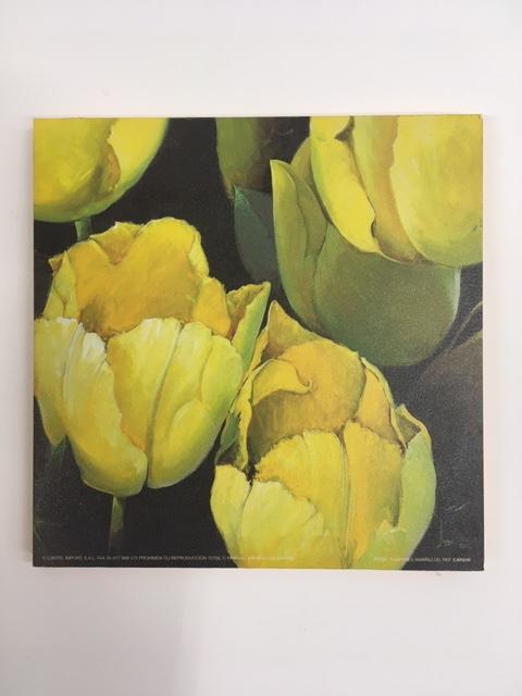 Ilustración laminada sobre madera con cantos amarillos de un conjunto de tulipas amarillas.
