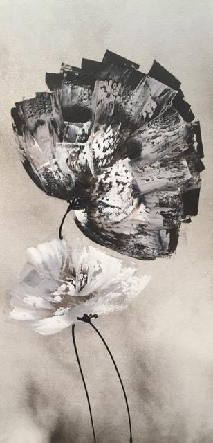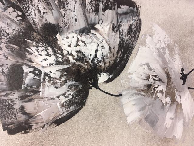 Fondo blanco roto difuminado con flor grande en tono visón y pequeña en blanco. Cantos del cuadro en color negro.