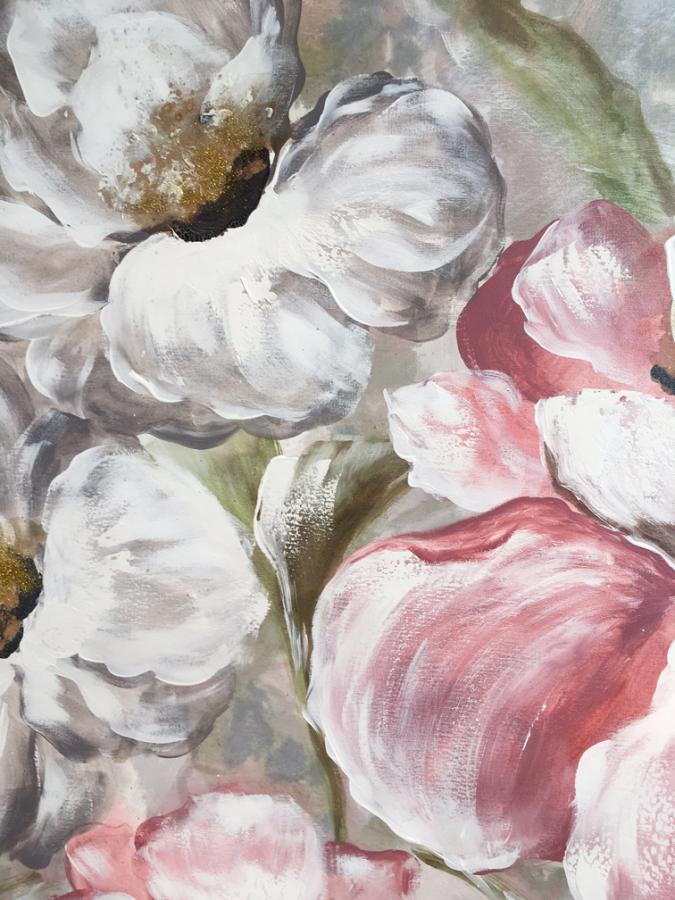 Cuadro original pintado a mano sobre lienzo montado en bastidor ancho . Flores en color pastel ideal para decorar una pared grande de comedor o dormitorio. Lleva purpurina que hace que el motivo sea mas bonito y brillante.