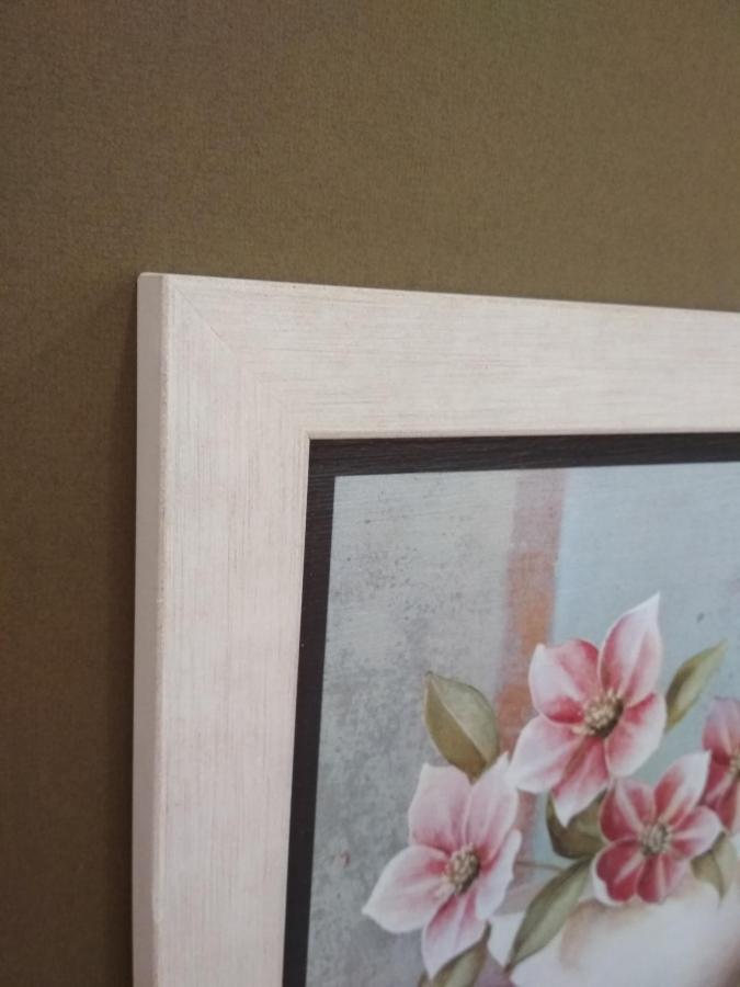 Incluyen marco de madera blanco envejecido. Perfil interior negro que resalta el resultado de la pintura.