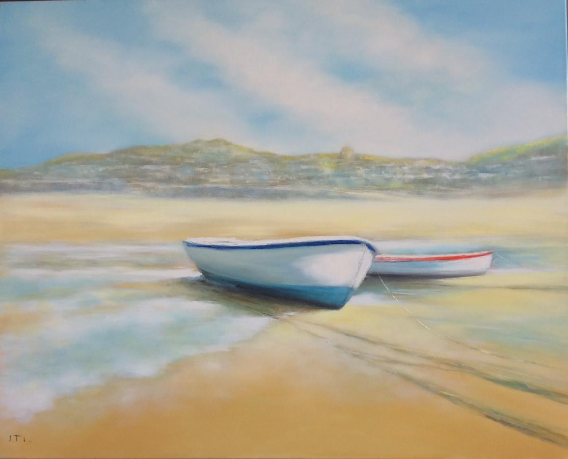Cuadro original representando una bonita vista de una playa con dos barcas y al fondo una panorámica de un pueblecito.