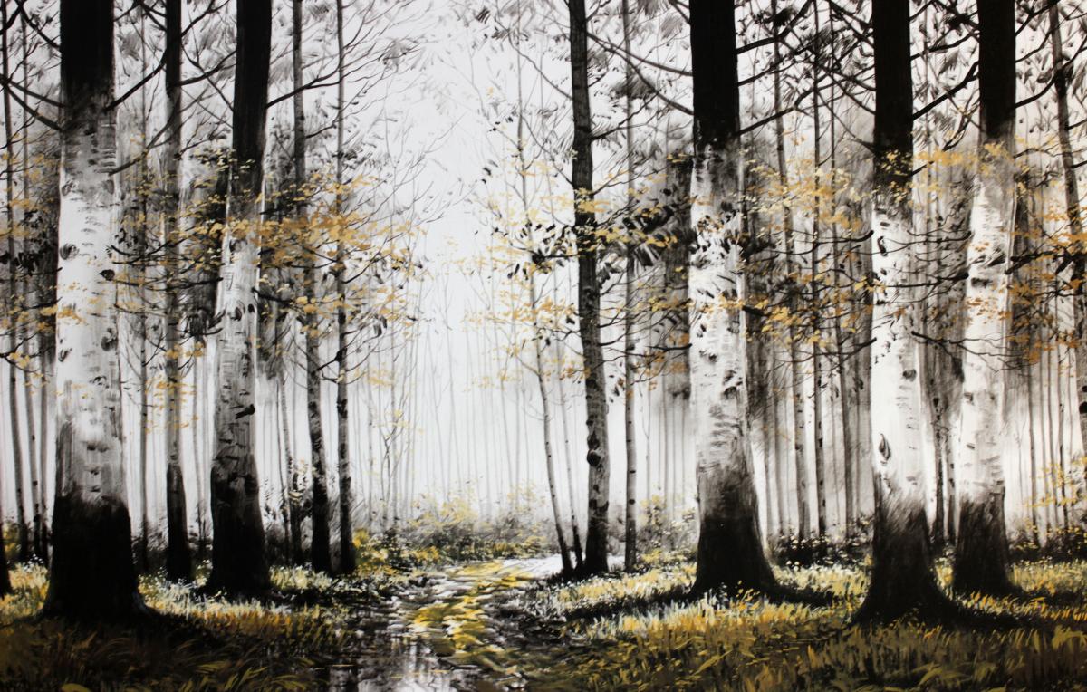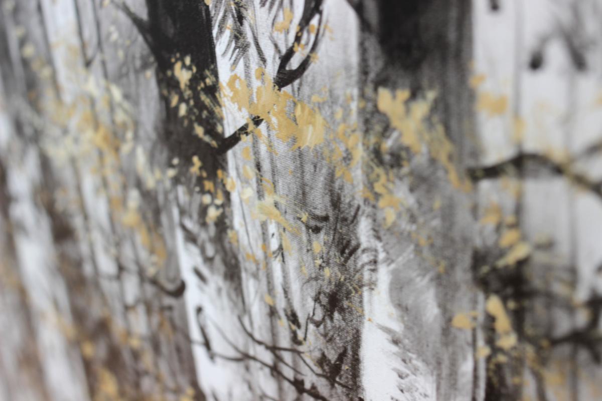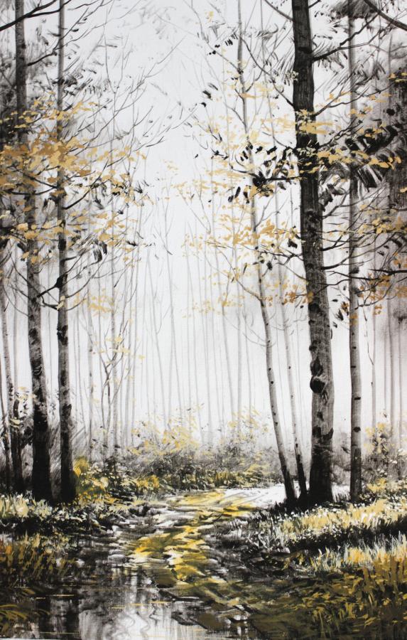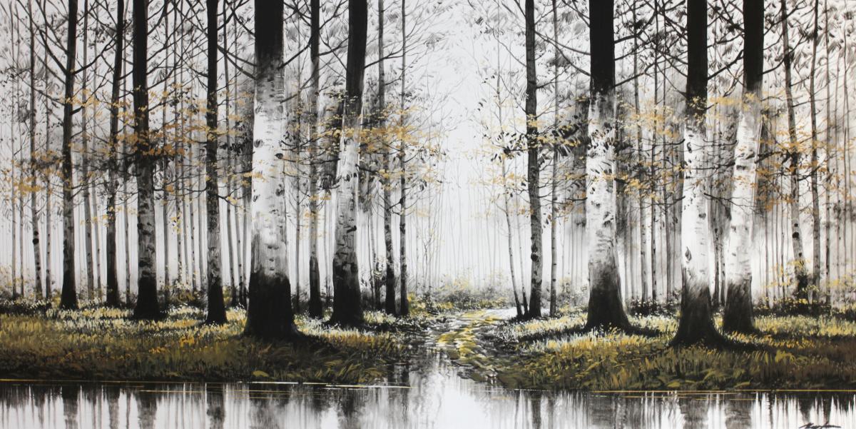 Bosque al lado de un río pintado en tonos negros, grises y blancos con pinceladas en color crema o blanco roto. Cantos del cuadro en color negro.