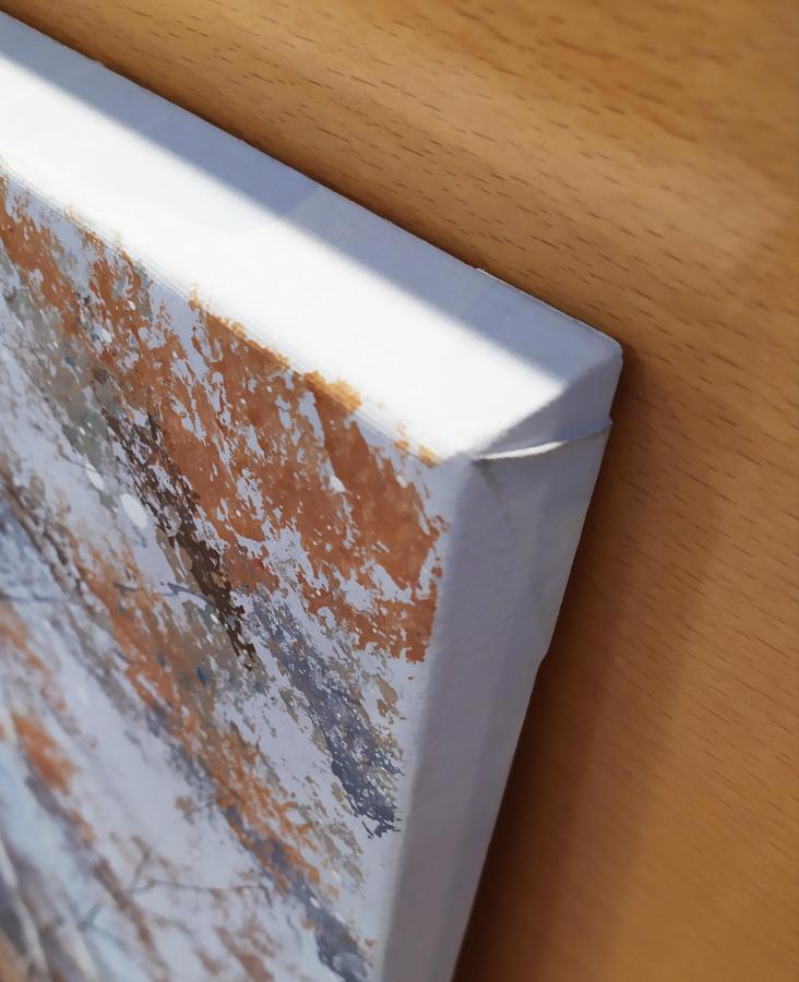 Pintado a mano al óleo sobre lienzo con bastidor grueso en tonos ocres,grises,azules y pinceladas suaves en color blanco.Cantos pintados en color azul cielo.