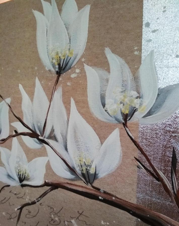 Flores de almendro en blanco con purpurina, remata laterales con bandas en pan de plata.