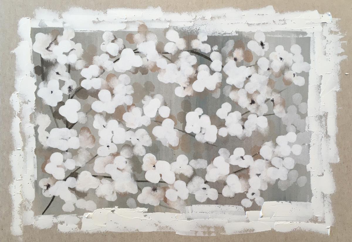 Pintado a mano sobre lienzo de bastidor grueso con fondo textil y detalles florales.